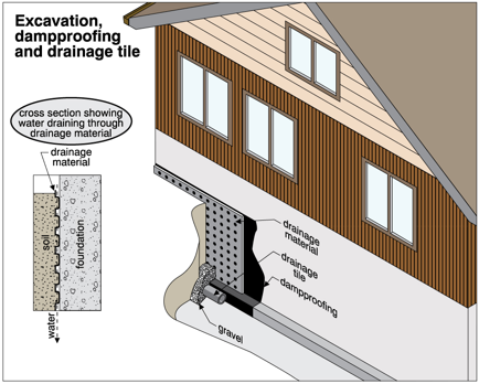 Excavating, dampproofing and installing drainage tiles should be used as a last resort. Dampproofing on the exterior typically involves parging a masonry foundation wall with a one-quarter inch layer of mortar covered with a bituminous or plastic membrane which extends down to the footings.