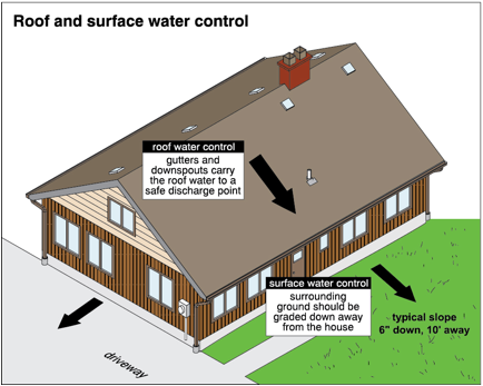 Poor surface drainage is one of the main causes of basement leaks. The ground should slope away from the house a rate of one inch per foot for at least the first six feet. As a preventative measure, seal where the driveway and sidewalk meet the foundation walls. The gutter and downspout systems must also perform properly. If downspouts are ever suspected of being disconnected, broken or clogged below ground level, they should be redirected to discharge above grade at least six feet away from the house. Also, gutters should be kept clear of debris.